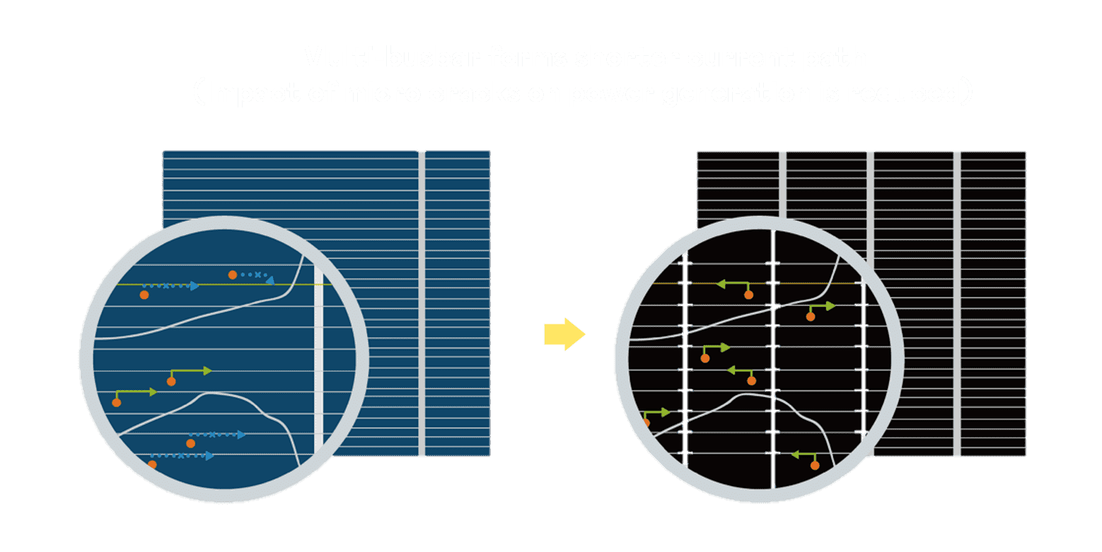 - 电池使用多条铜导线 (Copper wire) 于电池片上形成较短的电流路径,,,,提高电流收集效率,,采用圆形设计的铜导线较传统扁平式的铜焊带 (Ribbon),,,可增加入射至电池的光线量。。。