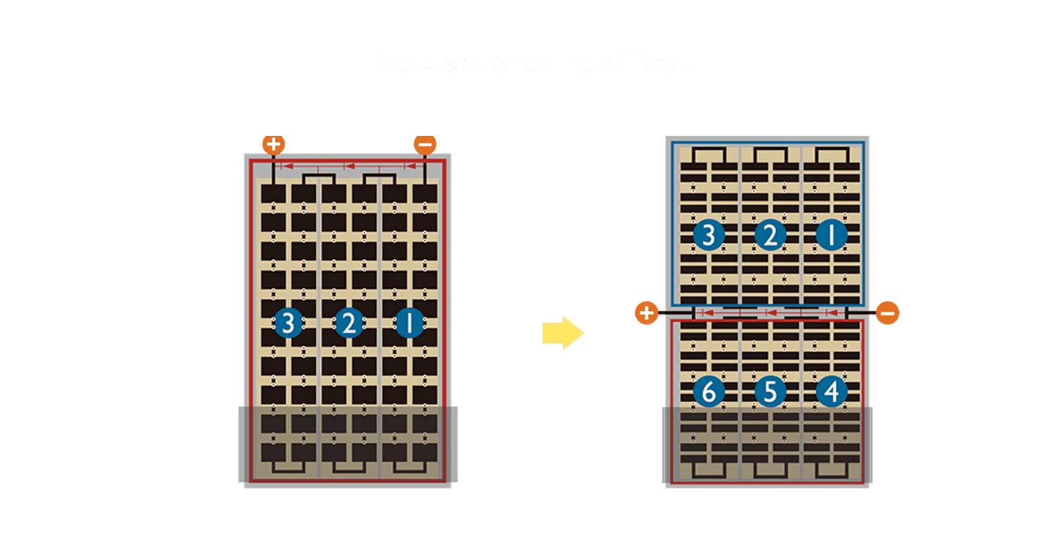 - 结合半切电池,,,,降低遮阴影响、、、提升模组抗隐裂能力、、、、并减少电阻损耗,,,进一步提升模组发电效能。。。
